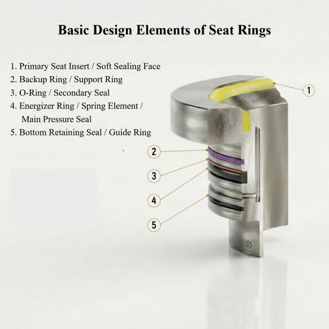 The basic design of a seat ring and its associated valve seat is built around several key functional elements that work together as an integrated sealing system. At the core is the primary sealing face, which forms the main contact band between the seat ring and the closure element, ensuring tight shut‑off and controlled leakage under pressure. Around this face, the design may include backup or support rings that help the seat ring resist deformation, extrusion and flattening at high differential pressures.
